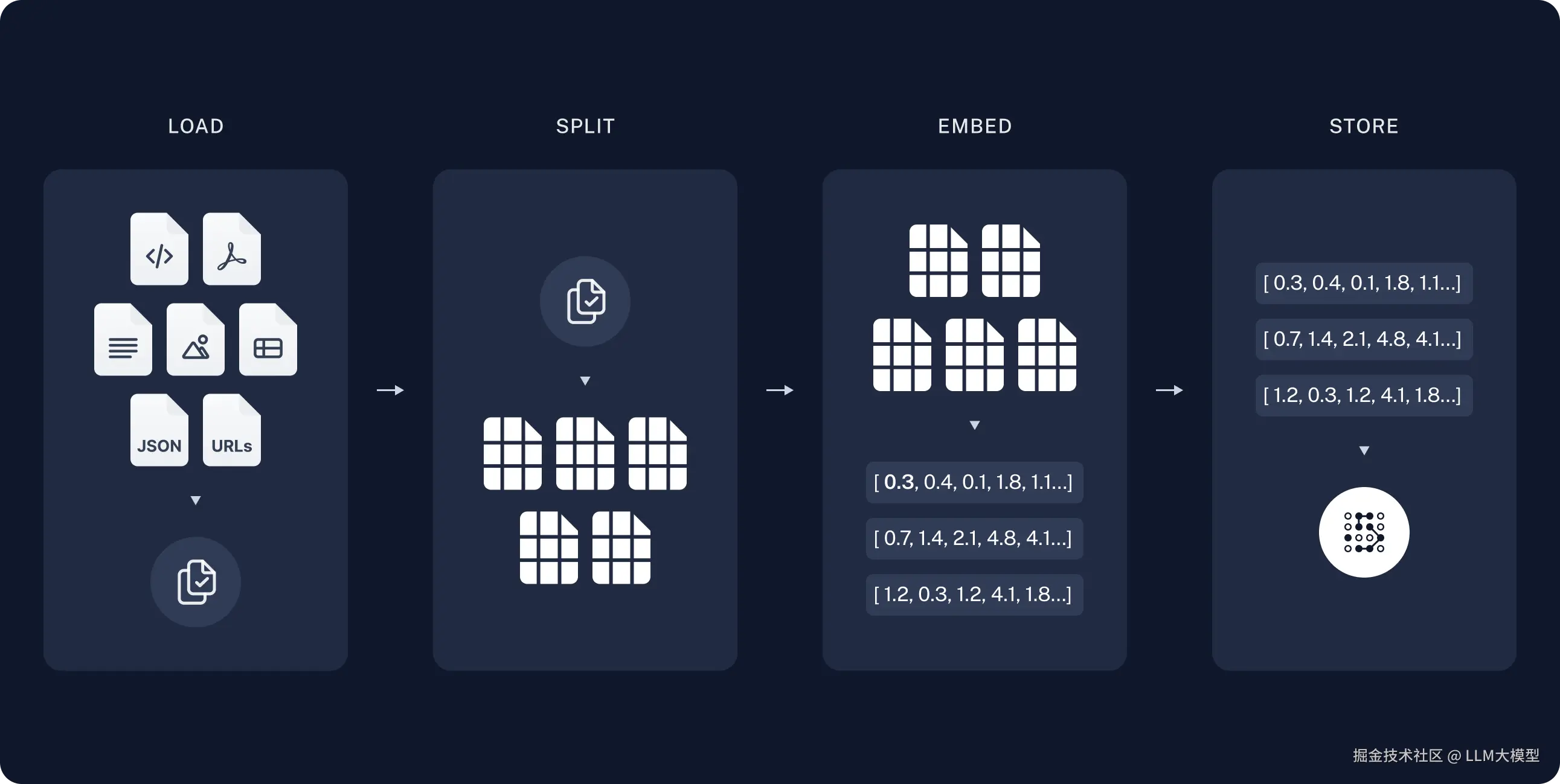 <font style="color:rgb(0, 0, 0);">Documents</font>)分成更小的块(chunks)。这对于索引数据和将其传递给模型都很有用,因为大块数据更难搜索,而且不适合模型有限的上下文窗口。 - 存储(Store) :我们需要一个地方来存储和索引我们的分割(splits),以便后续可以对其进行搜索。这通常使用向量存储VectorStore和嵌入模型Embeddings model来完成。