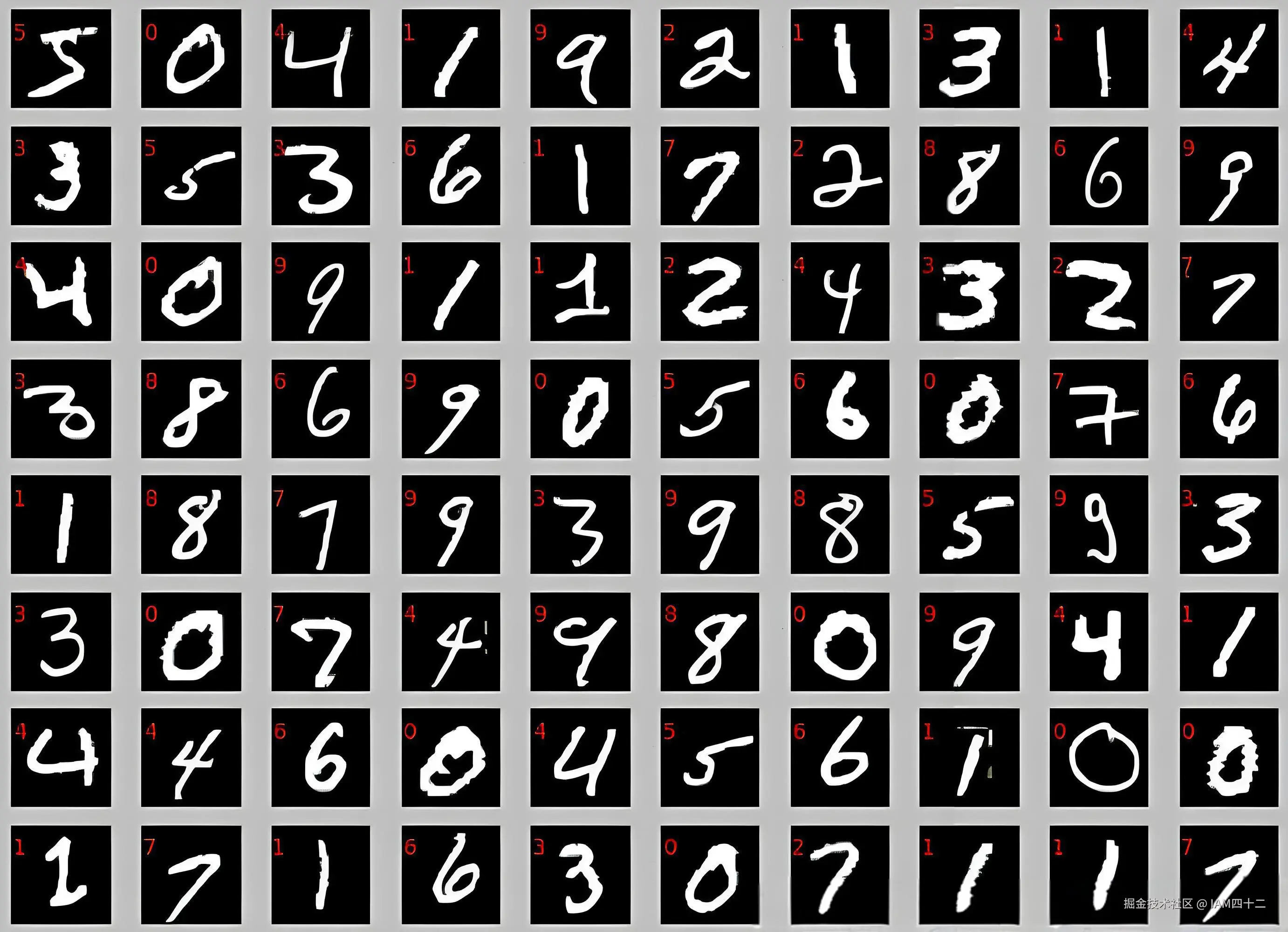 图中就是 MNIST 数据集的示例,图中每一个手写数字的图片都是 28x28 像素的单通道黑白图片