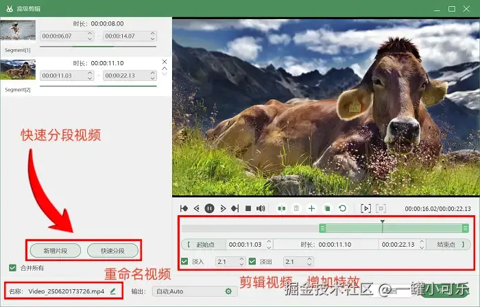 步骤3:录制的环节结束后,我们可以直接点击进入 “高级剪辑” 页面,对视频进行进一步处理,如快速分段视频、给视频加上各种转场特效等。