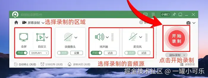 步骤2:选择好模式后,框选好需要录制的区域,同时还能灵活调整声音来源,包括系统声音、麦克风声音等。如果想对录制的视频参数进行设置,只需要打开 “输出设置” 就可以进行调整了。全都搞完之后,点击页面右侧的红色按钮就可以开始录制了。