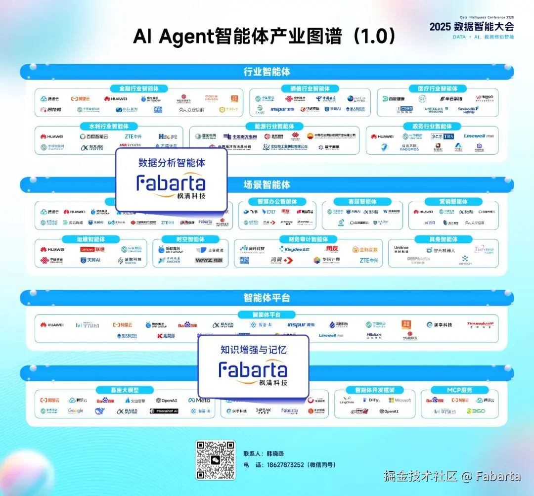 枫清科技(Fabarta)再度受邀参与本次大会 。 枫清科技 (Fabarta) 参编 的 《数据智能研究报告(2025年)》 于 本次大会上发布。 同时 ,枫清科技 入选《数据智能产业图谱(2025年)》 , 并且其 “数据分析智能体”和“知识增强与记忆”两款产品均成功入选《AI Agent智能体产业图谱(1.0)》 。此外, 枫清科技 ( Fabarta ) 智能 数据分析解决方案 于近期顺利完成了 由 信通院组织的信创大模型驱动的智能数据分析工具(ChatBI)专项测试, 在大会上 被授予证书 ,成为首 批通过该测试的企业之一 。
