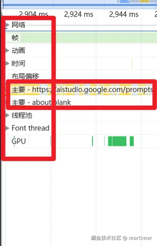 - 紫色 (Rendering & Layout):计算样式和布局。浏览器在计算每个元素应该在什么位置、是什么样子。