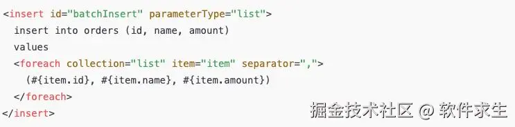这样,MyBatis 就会在一个 SQL 中拼接多组 values(),最后生成一个长 SQL,交由数据库一次性插入。