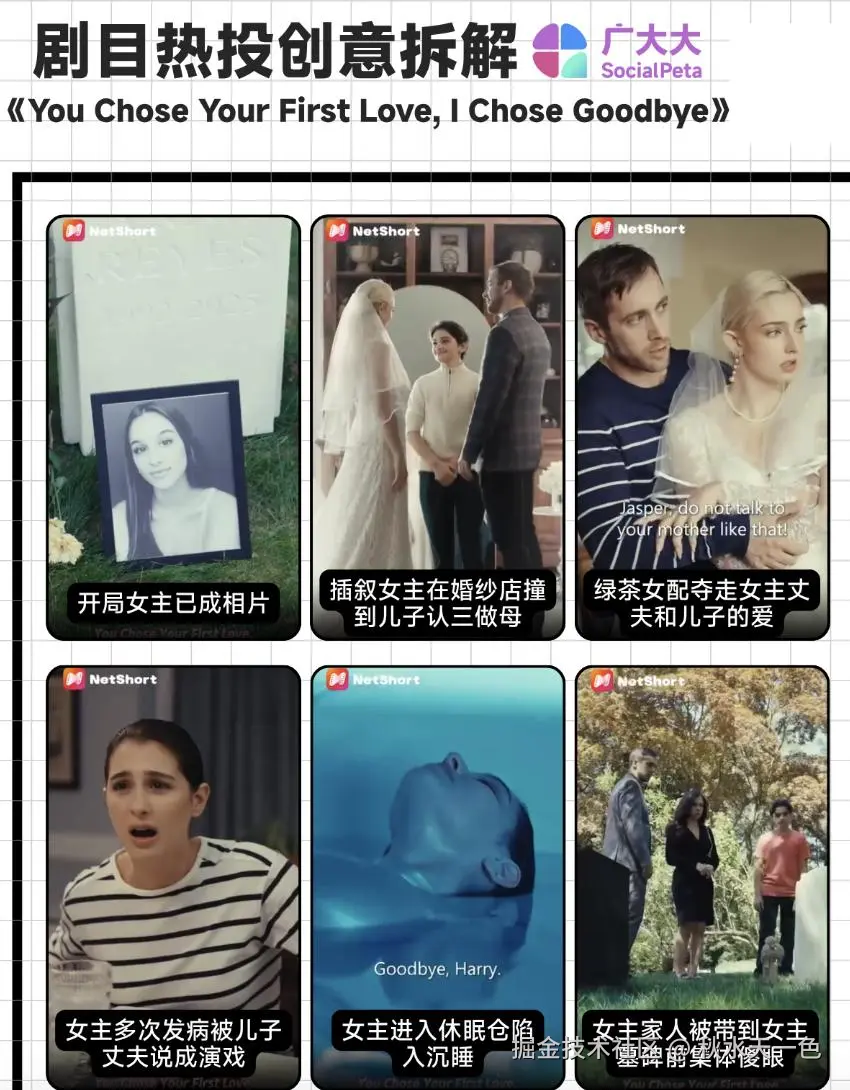 创意素材方面,本剧素材多采用插叙和倒序的手法,通过率先交代故事结局的手法,让观众好奇女主到底是怎样从对家人满心欢喜再到心灰意冷的。本素材的开头和结尾呼应,女主家人在看到女主墓碑之前还想着让女主给绿茶道歉,下一秒看到女主墓碑集体傻眼,鲜明的转变让观众心中也能出口恶气。