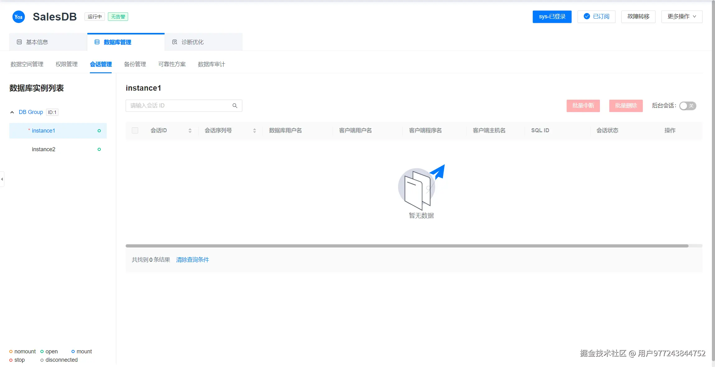 会话管理提供查看当前实例已经连接的会话信息,用户会话的删除和中断功能。
