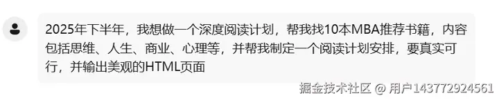 2025年下半年,我想做一个深度阅读计划,帮我找10本MBA推荐书籍,内容包括思维、人生、商业、心理等,并帮我制定一个阅读计划安排,要真实可行,并输出美观的HTML 页面。