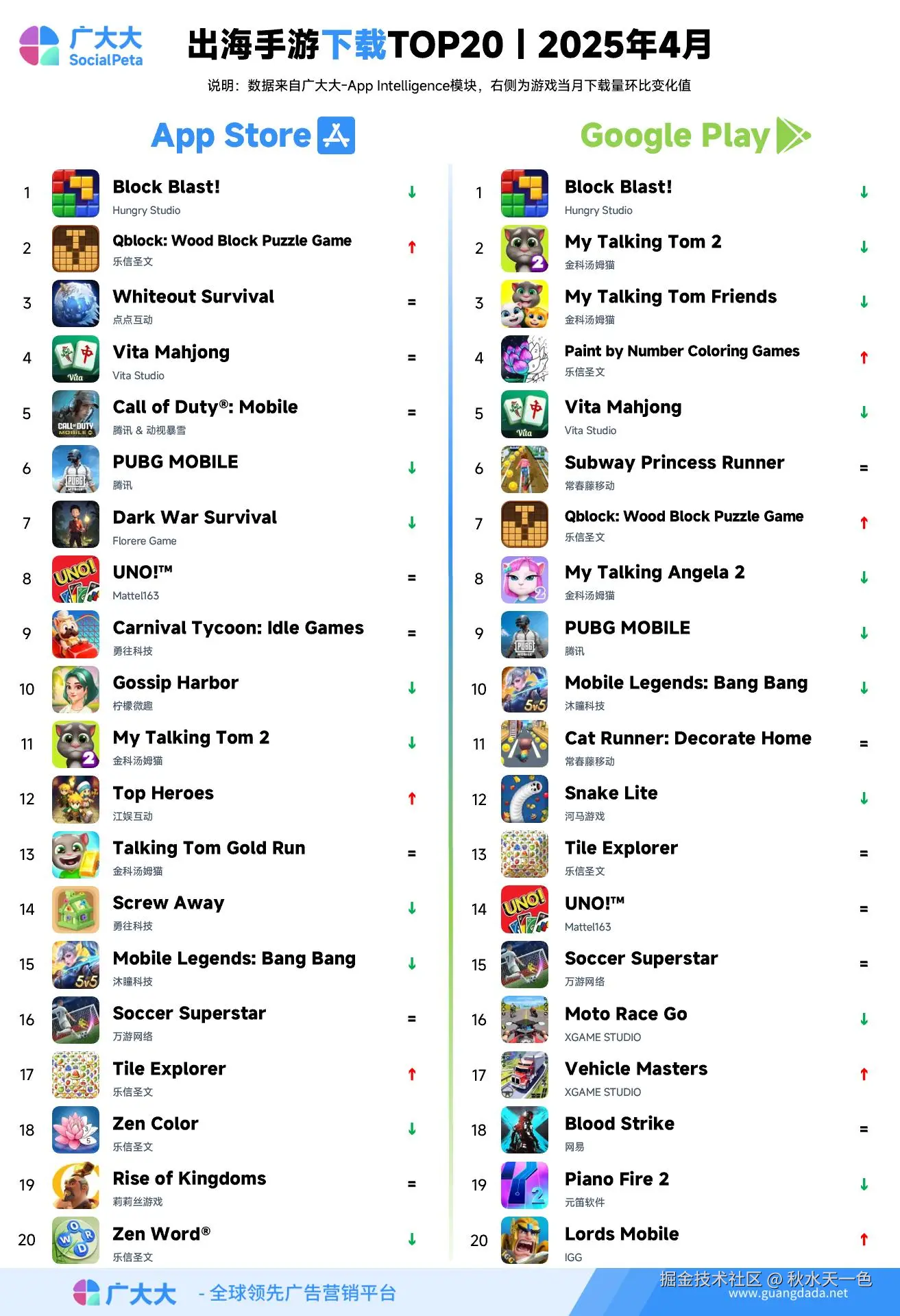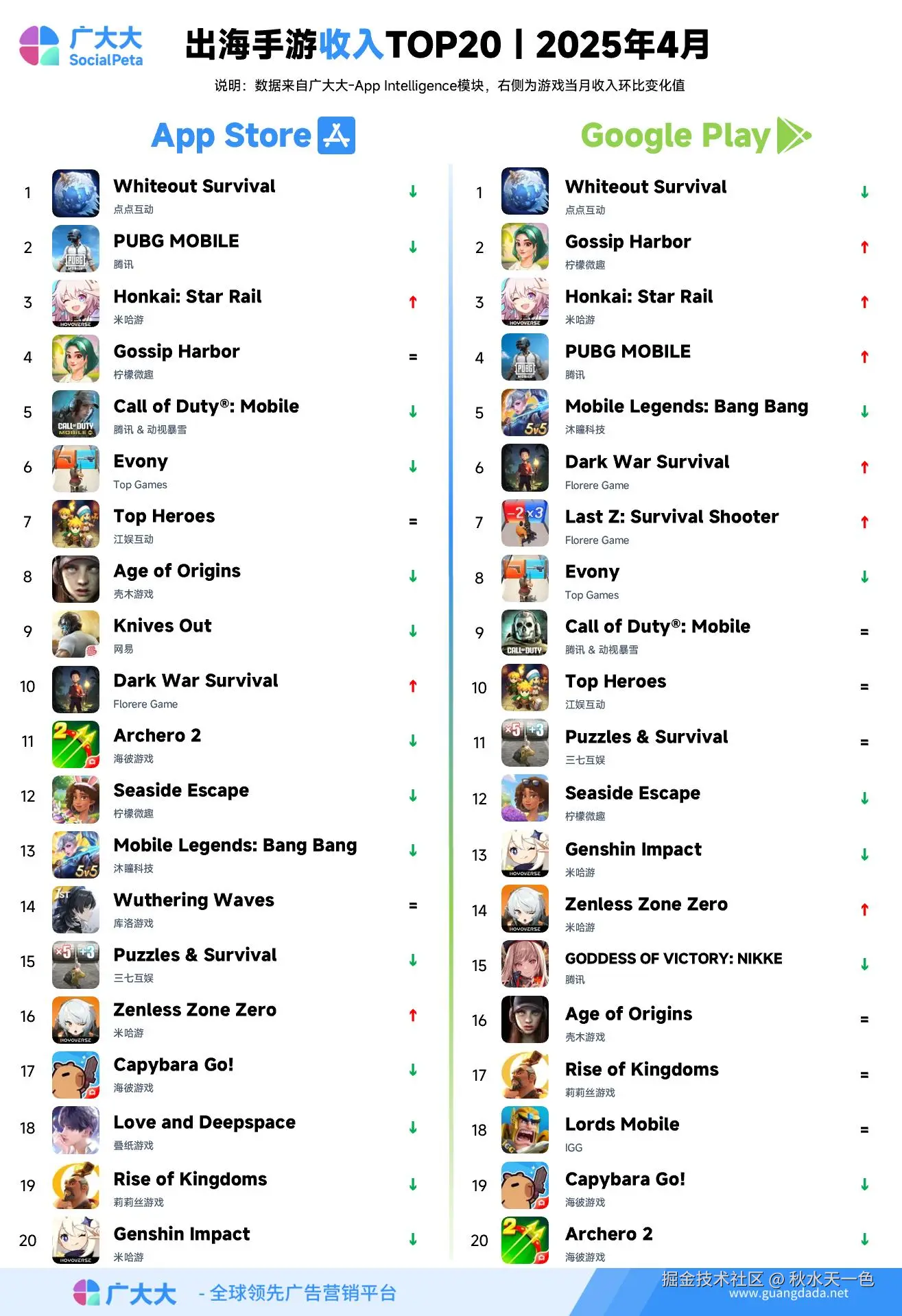 根据广大大——App Intelligence等模块数据,我们整理出广大大2025年4月成功出海手游投放、收入和下载TOP20榜单,帮助更多出海手游从业人员了解全球移动市场变化趋势。
