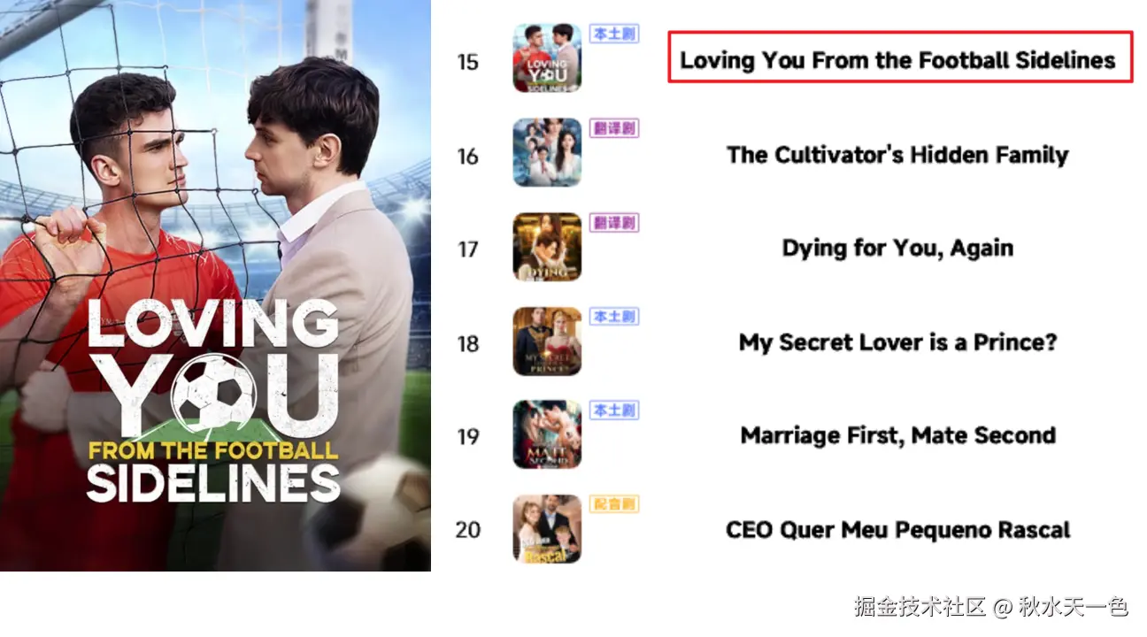 在BG短剧开发完各色职业运动员之后,我们双男主短剧也开始进军体育圈,明星编剧宋华婷带来新剧《Loving You From the Football Sidelines》,同时也是上周短剧投放榜中唯一一个在榜的双男主短剧,排面算是拉满了。