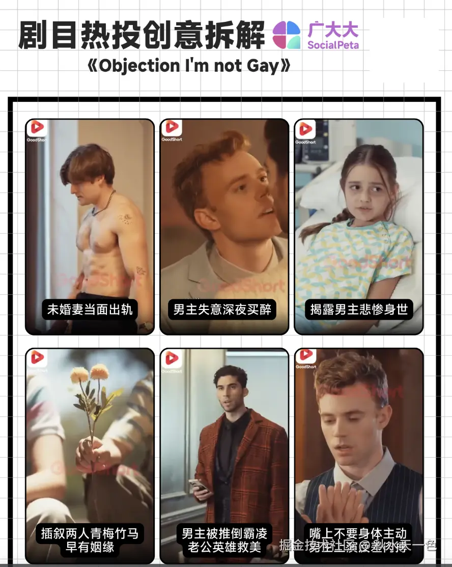 炸裂的剧情宛如单依纯的《珠玉》在前,买量素材同样跳出五行外。根据广大大抓取数据显示,《Objection I'm not Gay》6月发布于【GoodShort】,累计投放素材2K条,短素材多在1分钟以内,长素材时长则稳定在10-18分钟,基本囊括了抓奸反被打、酒后活动、意外结婚、法庭冲突、英雄救美等爆点。