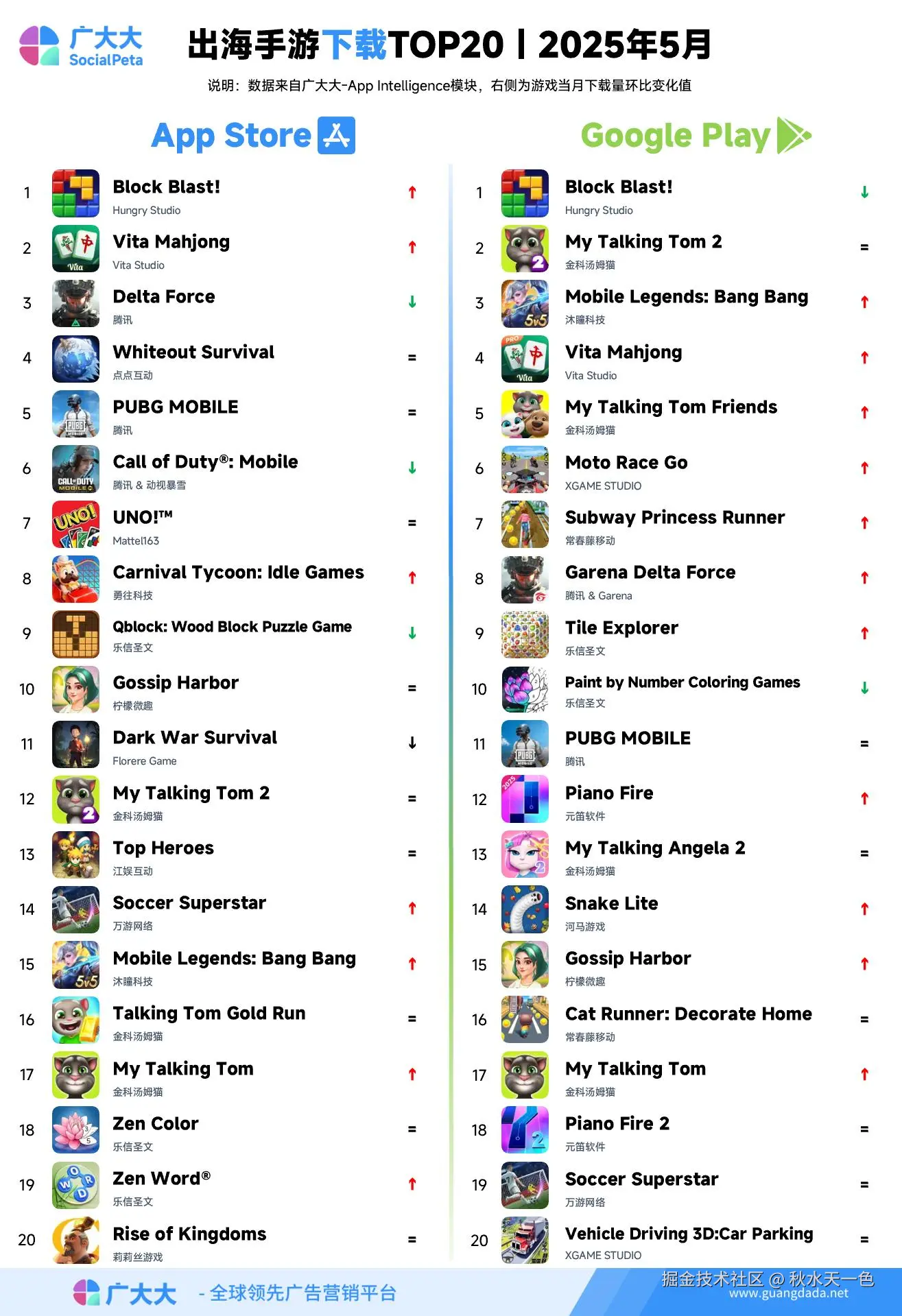 根据广大大——App Intelligence等模块数据,我们整理出广大大2025年5月成功出海手游投放、收入和下载TOP20榜单,帮助更多出海手游从业人员了解全球移动市场变化趋势。