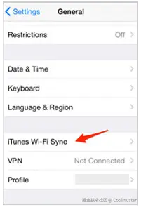 之后,拿起你的 iPhone,进入“设置”,点击“通用”,然后选择“iTunes Wi-Fi 同步”,并点击“立即同步”。