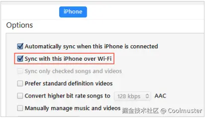 如果 iTunes 无法通过 USB 数据线同步你的 iPhone,你可以尝试通过 Wi-Fi 同步。在电脑上打开 iTunes,进入设备摘要页面,然后勾选“通过 Wi-Fi 与此 iPhone 同步”选项。
