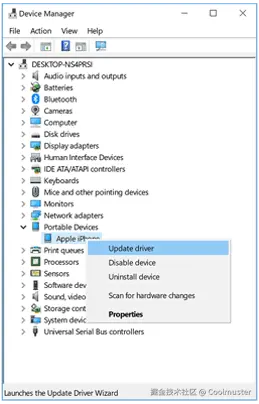 右键单击“Apple iPhone”,然后选择“更新驱动程序”。