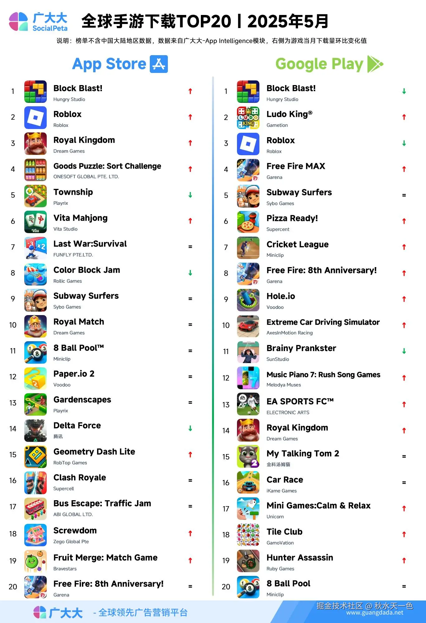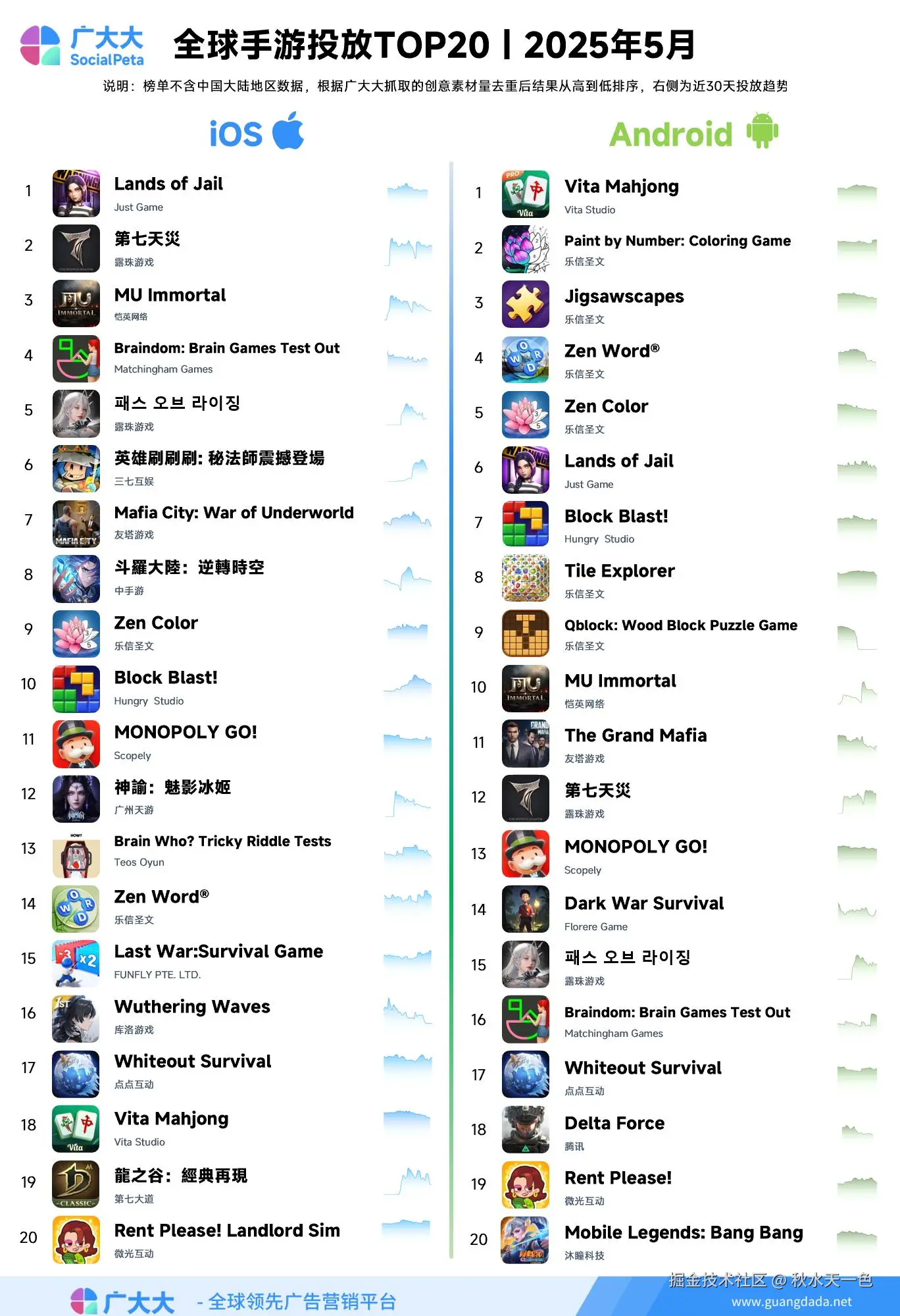 根据广大大——App Intelligence等模块数据,广大大数据研究院整理并发布广大大2025年5月全球成功手游投放、收入和下载TOP20榜单,帮助更多移动应用从业人员了解全球移动市场变化趋势。
