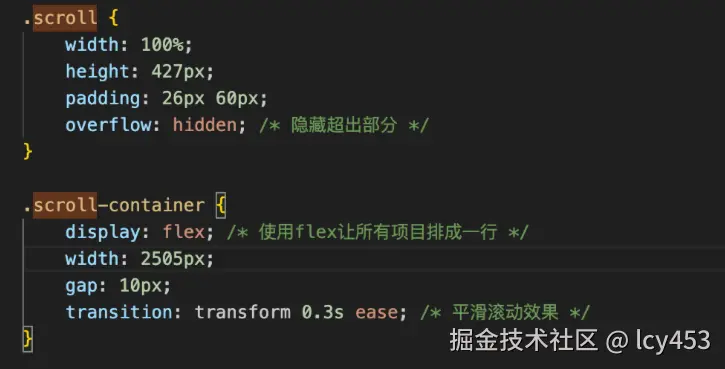 其实就这么简单,两个盒子,父盒子展示,子盒子作为容器装图片,根据父盒子能展现的图片来展示。其他的隐藏在容器之中。这里用flex布局,所有的子盒子中的子元素全部横向排列。间隔是10px,而且添加动画效果,平滑滚动效果,transform。
