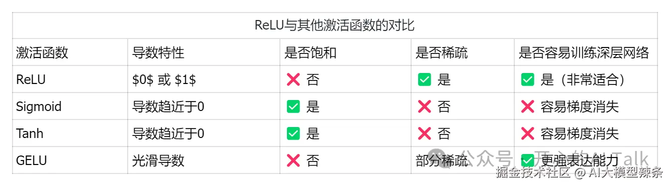 ReLU/GELU对比:ReLU更快更稀疏,GELU更平滑,很多LLM使用GELU,但ReLU仍作为可选高效替代