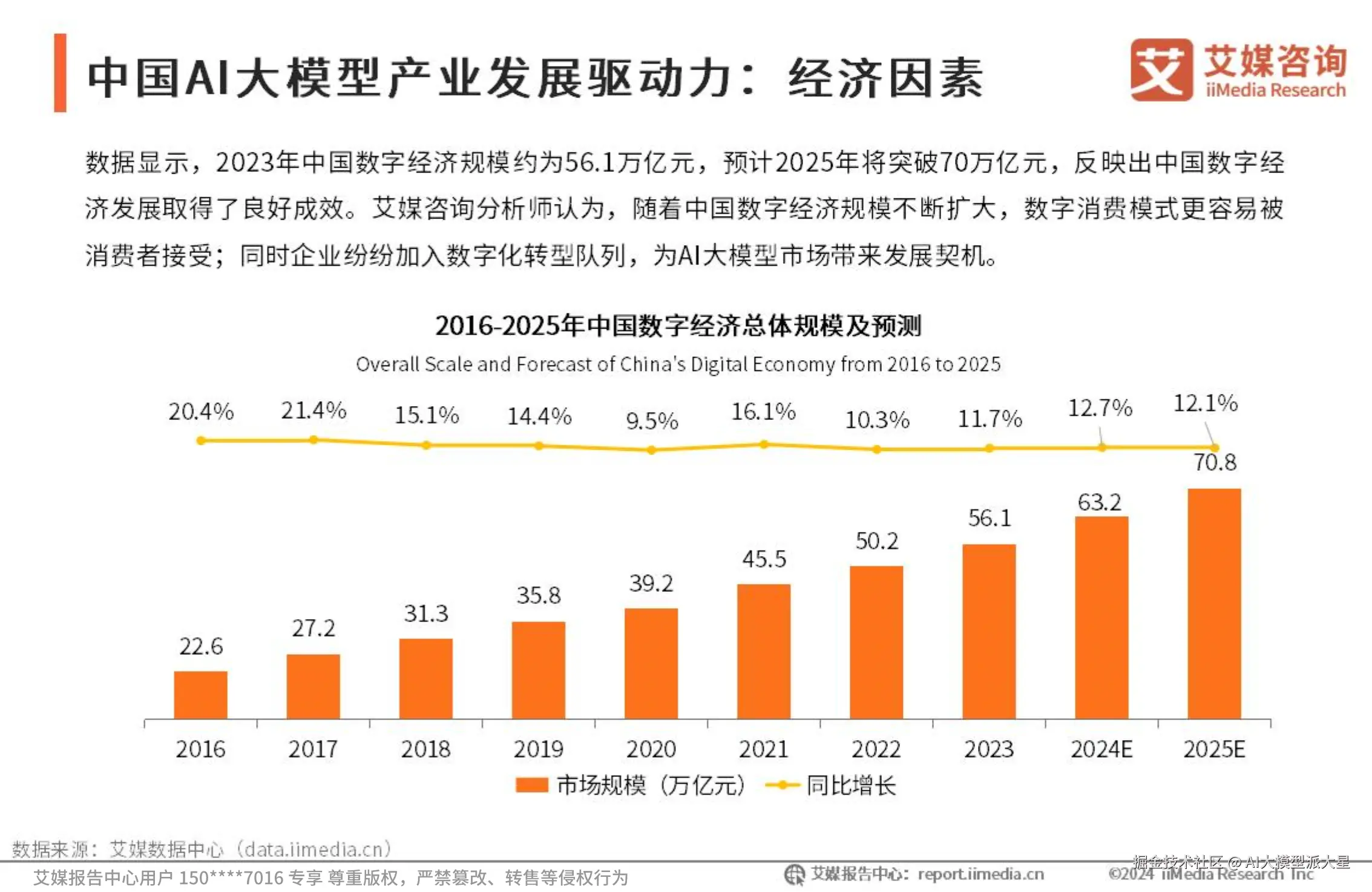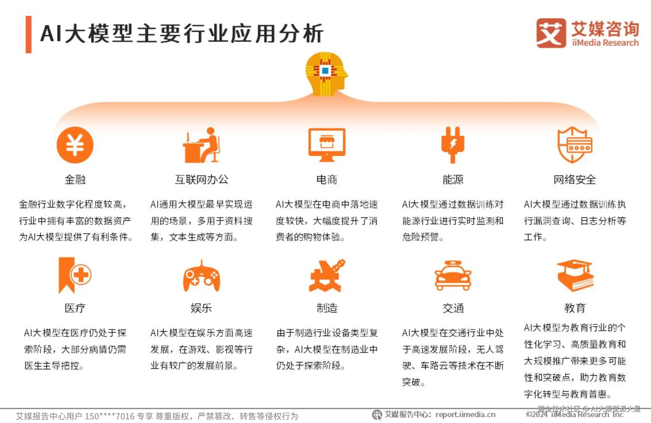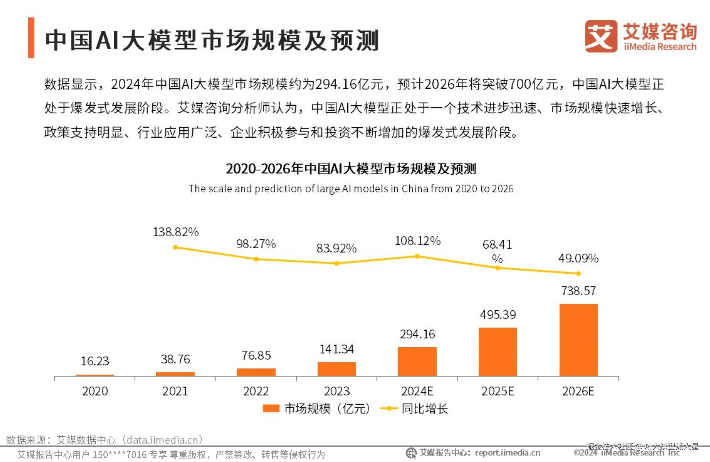 自OpenAI发布ChatGPT以来,大模型产业掀起全球的关注,AI大模型已经成为科技创新的新高地。AI大模型因其强大的数据处理能力和卓越的性能表现,被视为推动产业升级和经济转型的重要引擎。近年来,中国积极布局、大力支持AI大模型发展,相关科技公司积极研发国产大模型,同时不断涌现出大量大模型科技公司。随着技术的不断成熟和应用场景的不断拓展,AI大模型正逐渐渗透到各行各业,成为推动社会进步和经济发展的新动力。全球新经济产业第三方数据挖掘和分析机构iiMedia Research(艾媒咨询)最新发布的《2024-2025年中国AI大模型市场现状及发展趋势研究报告》数据显示,2024年中国AI大模型市场规模约为294.16亿元,预计2026年将突破700亿元,中国AI大模型行业正处于爆发式发展阶段。