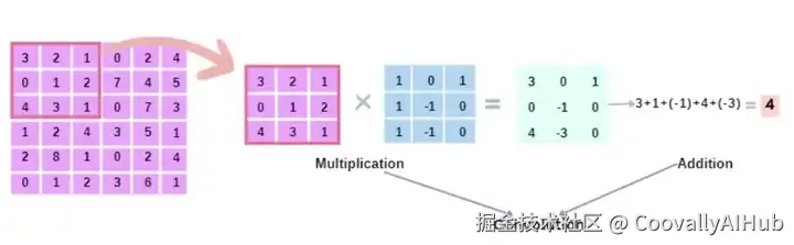 - 求和: 将所有乘积结果相加,得到一个单一的标量输出值。这个值代表了滤波器在当前局部区域检测到的特征响应强度。这个过程即卷积。