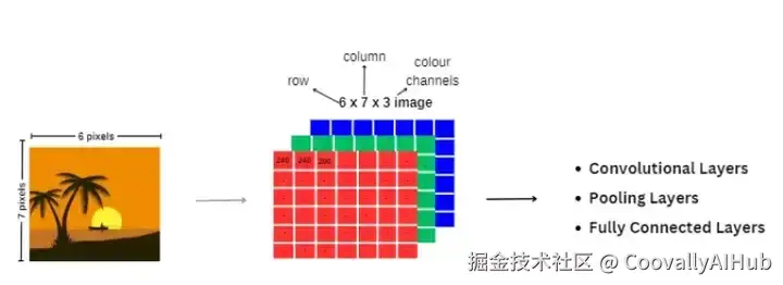 一个典型的 CNN 架构主要由三种核心层类型构成:卷积层 (Convolutional Layers)、池化层 (Pooling Layers) 和 全连接层 (Fully Connected Layers)。