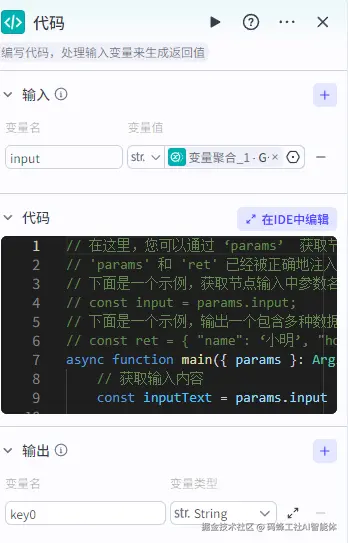 // 在这里,您可以通过 ‘params’ 获取节点中的输入变量,并通过 'ret' 输出结果