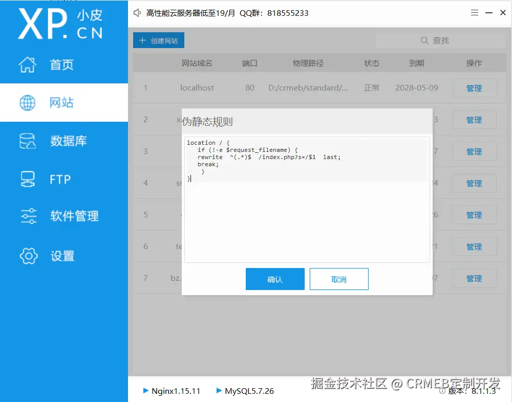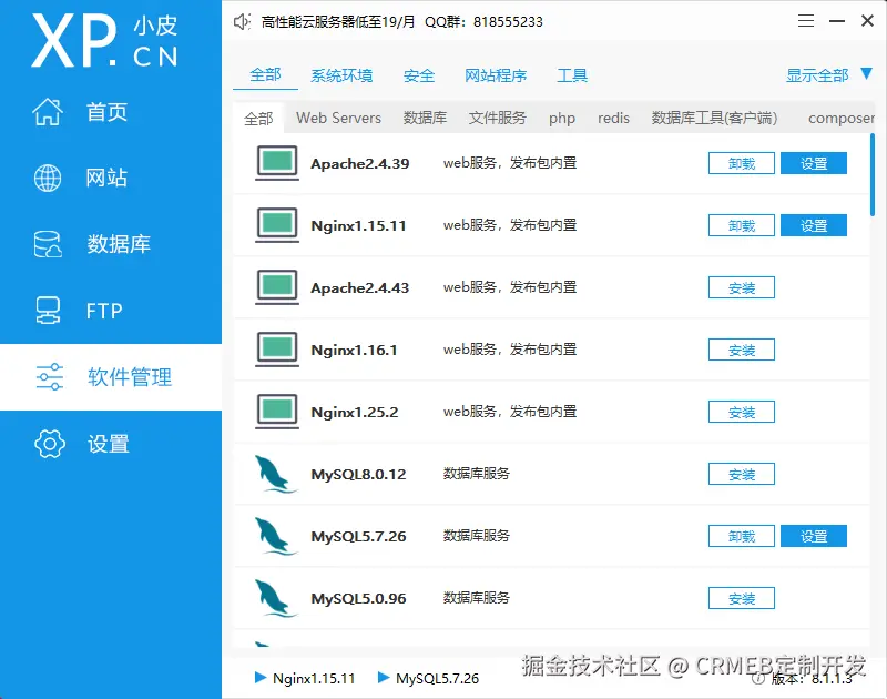 安装完成之后打开,在软件管理中安装 nginx mysql 5.7 php 7.4