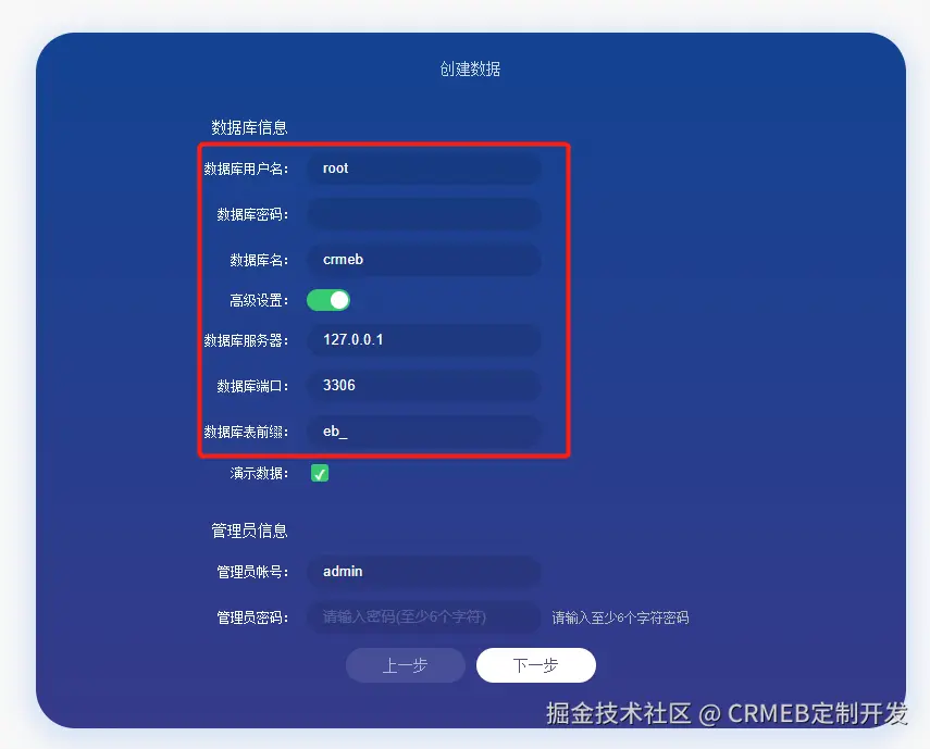 第三步,填写安装信息,数据库信息为添加站点时候生成的数据库信息(如果忘记了可以在宝塔左侧菜单中数据库里面查看)