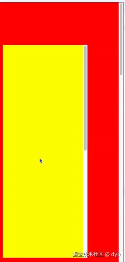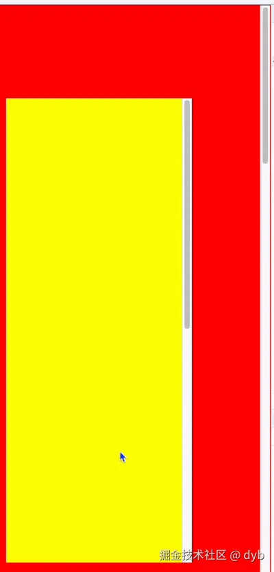 但是呢这个属性实现的效果并不完美,以上方示例的黄色滚动区域为例,如果黄色区域是可以滚动的,那么该属性有效,如果黄色区域不可以滚动,该属性就会失效了,所以没办法只能另寻他法,用JS去解决这个问题