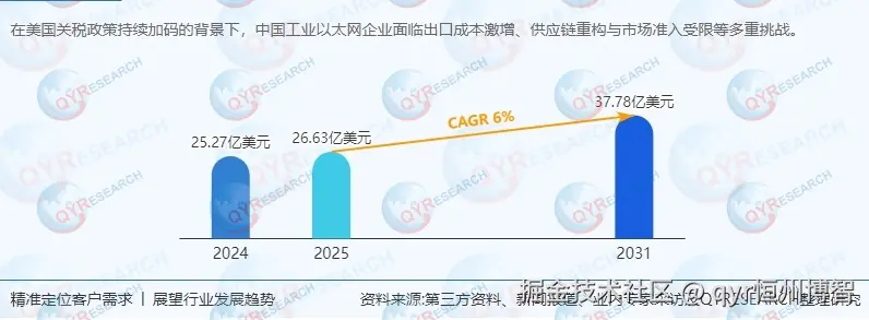 根据QYResearch最新调研报告显示,2024年全球工业以太网市场规模达25.27亿美元。按不同情景预测: