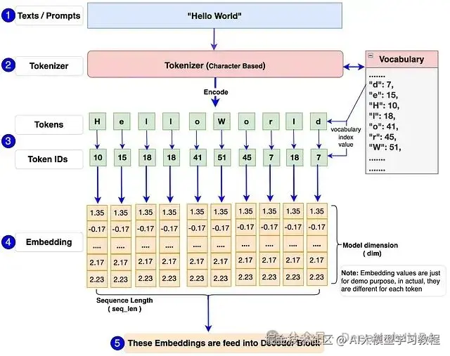 首先,单个或批量文本/提示被输入模型。例如:图中的"Hello World"。