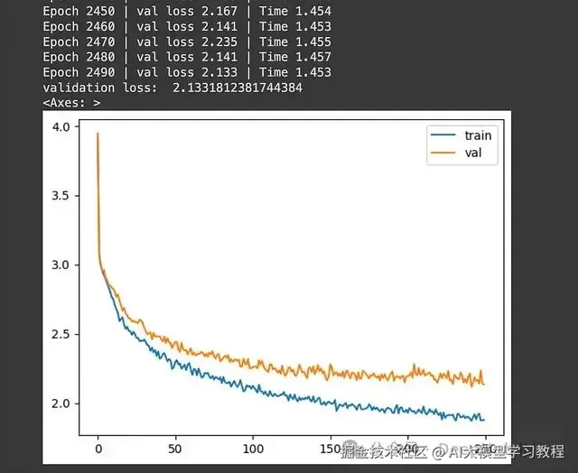 上图显示了训练和验证损失的变化。训练进行了2500个epoch。使用Google Colab的默认GPU和RAM设置,整个训练过程大约花费了10分钟,这是相当快速的。最后一个epoch的验证损失为2.19,考虑到我们使用的训练数据量和epoch数量,这个结果是可以接受的。要显著降低损失,我们还需要增加训练数据的规模、提高epoch数量,并使用更强大的GPU或处理能力。