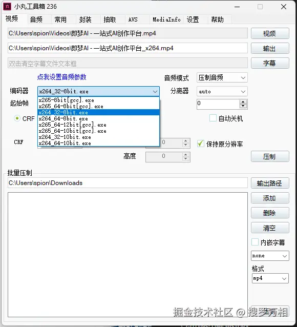 x264.exe是06_taro编译的x264_32_tMod-8bit-420.exe,软件已经附带x264_32_tMod-10bit-420.exe。用户可自行替换为10bit版本,其他版本请点击06_taro编译版。注意:XP系统需要安装Microsoft.NET Framework 2.0小丸工具箱(视频图形界面压制器)是一款可以压制H264+AAC视频的图形界面工具,内核是x264、neroaac、mp4box等开源软件,属于傻瓜型压制工具。