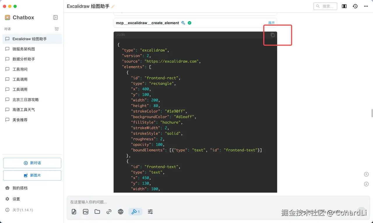 最终会生成一个 Excalidraw 特有的 JSON 文件,我们将其复制: