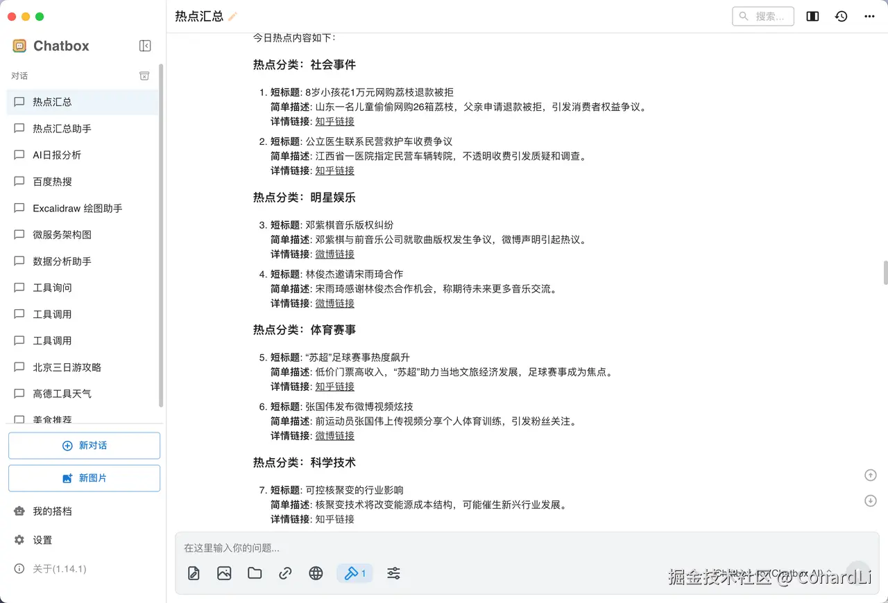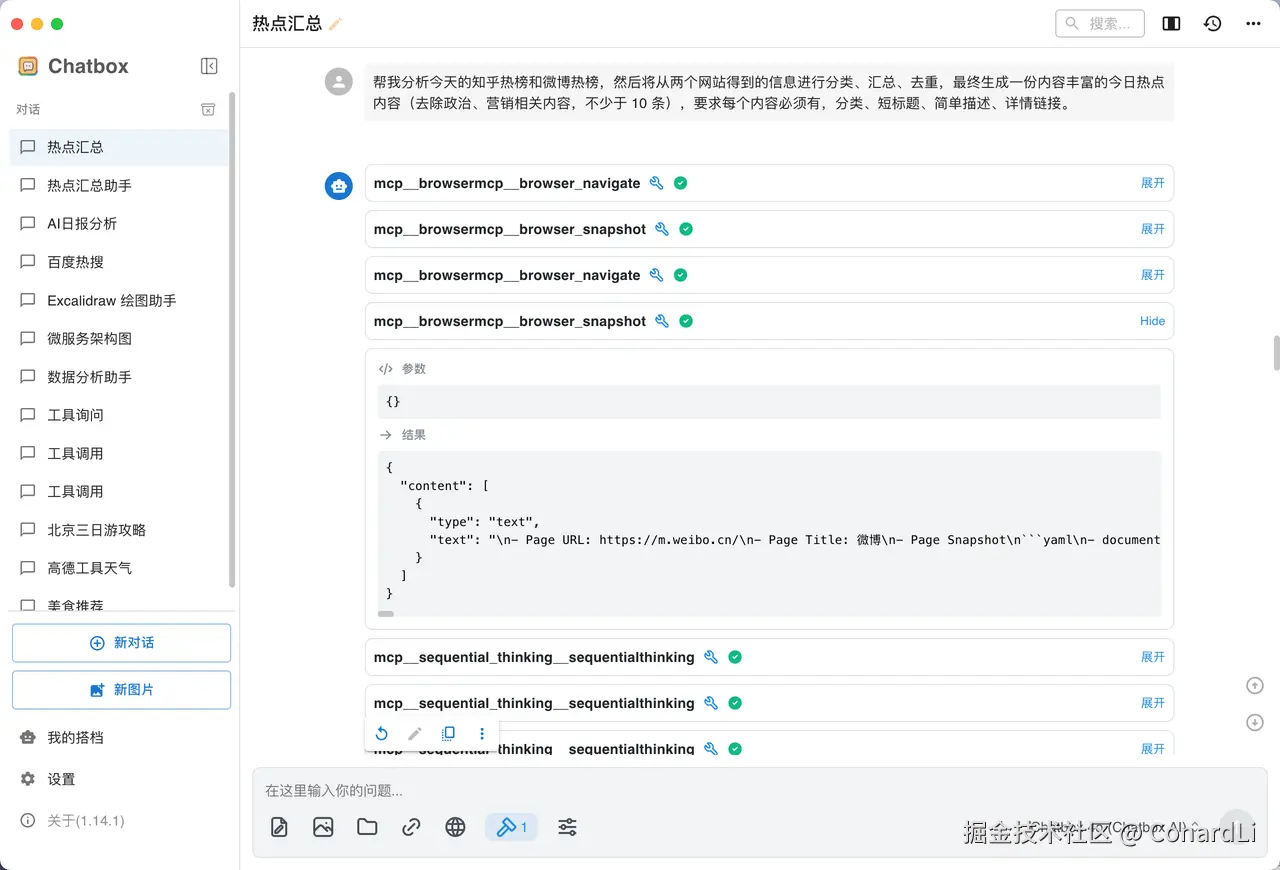 基于这个流程,大家完全可以自己封装一个定时任务,每天固定时间让 AI 完成热点信息的分析和整理,并且将整理好的内容发送给你,大家可以自己去扩展 ~