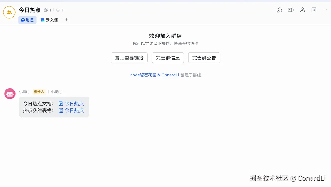 下面,我们借助飞书的 MCP( @larksuiteoapi/lark-mcp)帮我们将爬取到的任务整理为飞书文档和表格,并且通过机器人发送消息给我们: