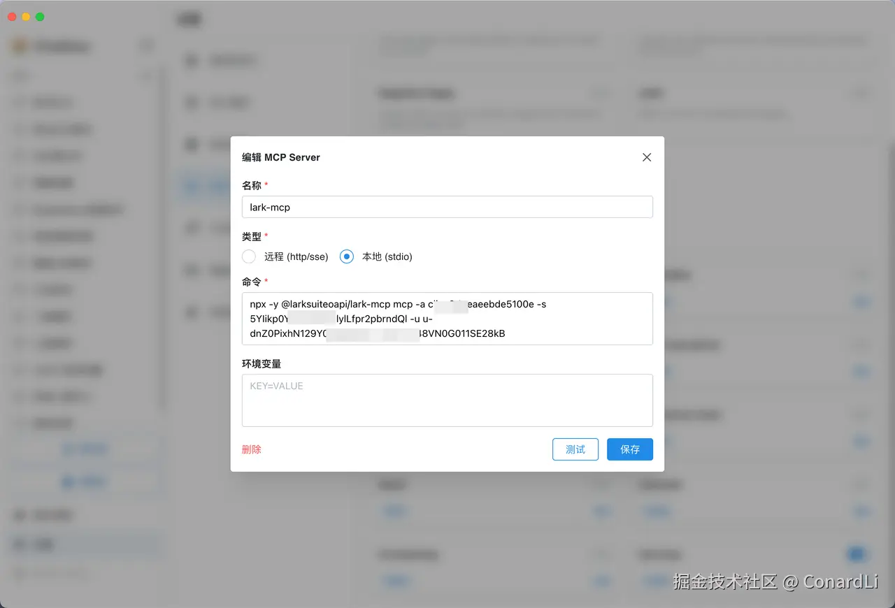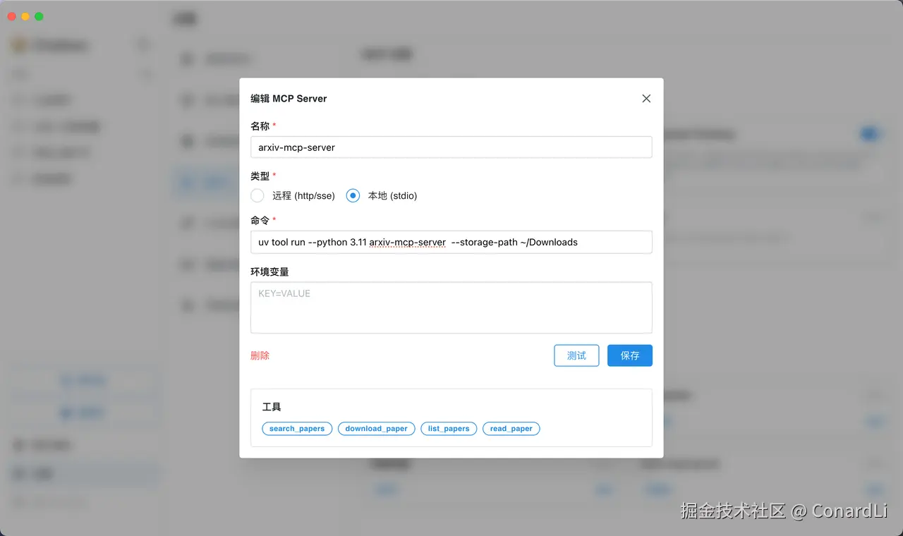 进入【设置 - MCP - 自定义 MCP 服务器】选择添加自定义服务器,选择本地,粘贴如下配置
