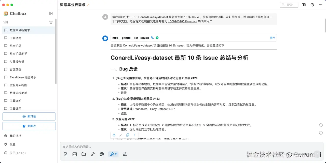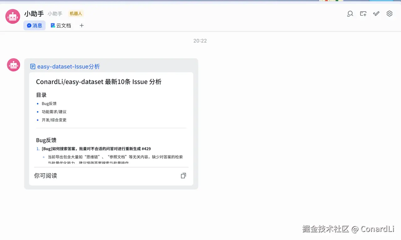 提示词:帮我详细分析一下,ConardLi/easy-dataset 最新增加的 10 条 Issue ,按照清晰的分类、友好的格式进行整理。并且将以上信息创建一个飞书文档,然后将文档链接发送给邮箱为 1009903985@qq.com 的飞书用户的聊天窗口。