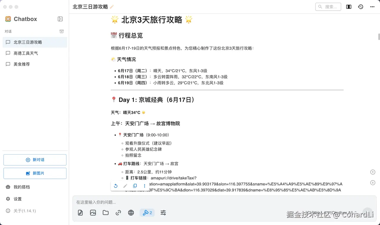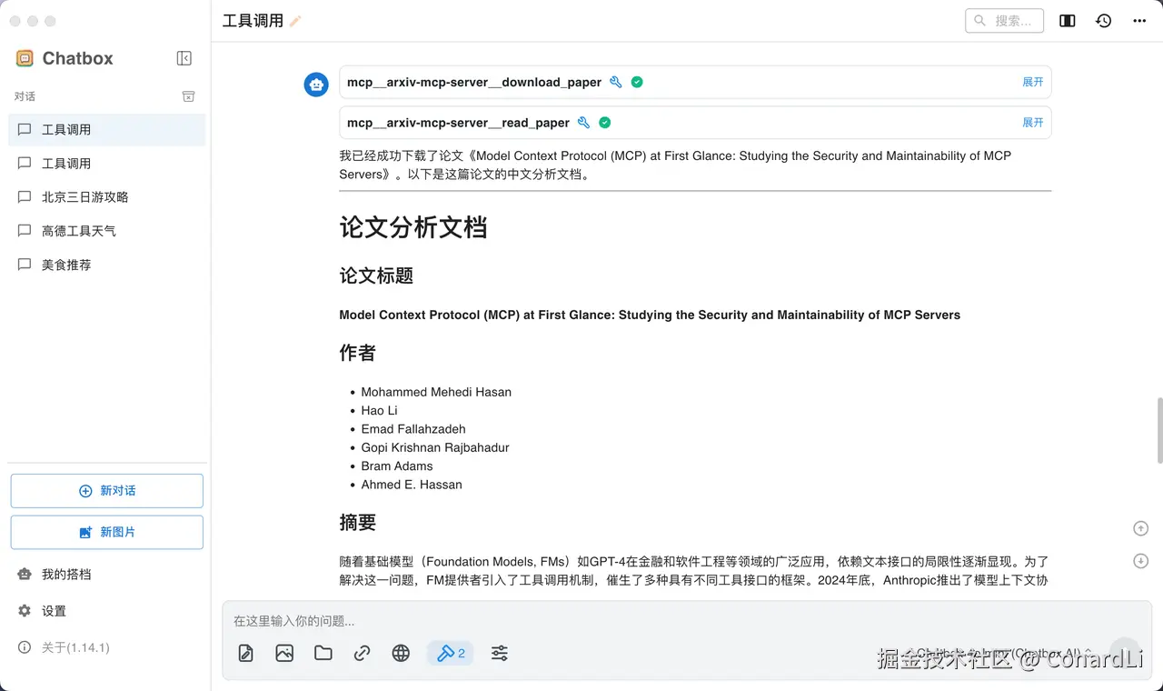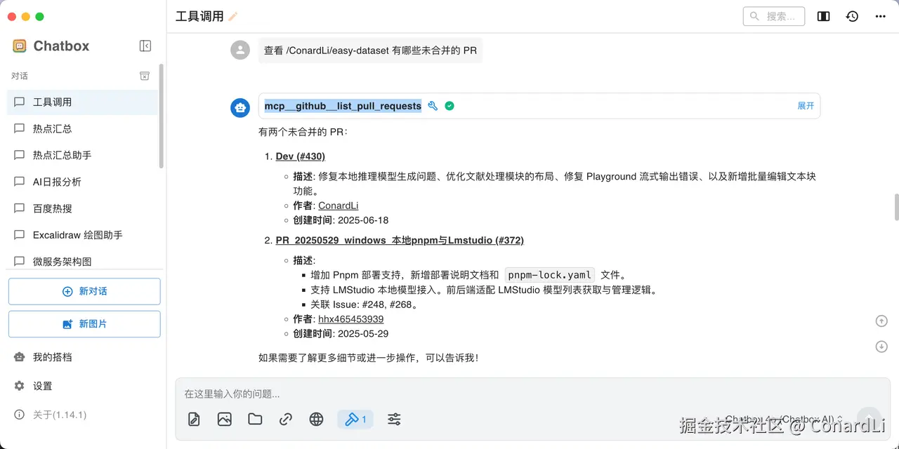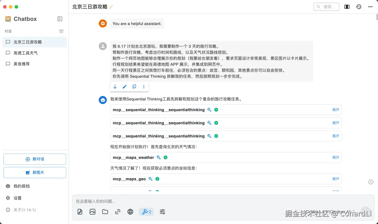 这次我们使用到的 MCP Host 是 Chatbox ,Chatbox 是我一直在本地使用的一款本地 AI 聊天软件,但是之前一直不支持 MCP,前几天发现在最新的 1.14 版本中终于支持上了 MCP ,于是立马来体验了一下,效果非常不错: