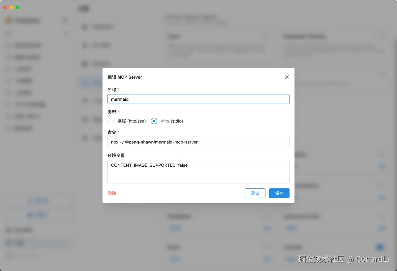 我们先来尝试生成 Mermaid 语法的架构图:首先配置: @peng-shawn/mermaid-mcp-server (输入命令 npx -y @peng-shawn/mermaid-mcp-server) , 然后将环境变量配置为:CONTENT_IMAGE_SUPPORTED=false(将图片文件保存到本地目录)