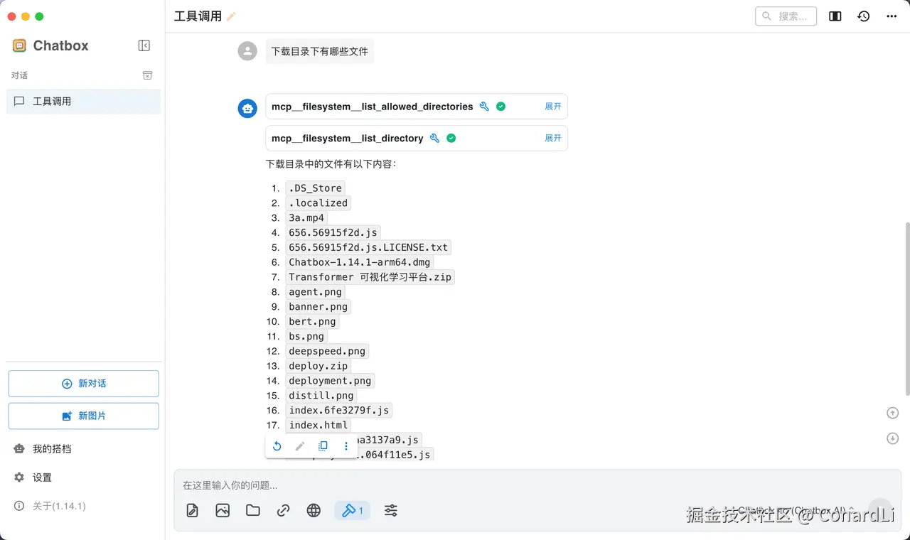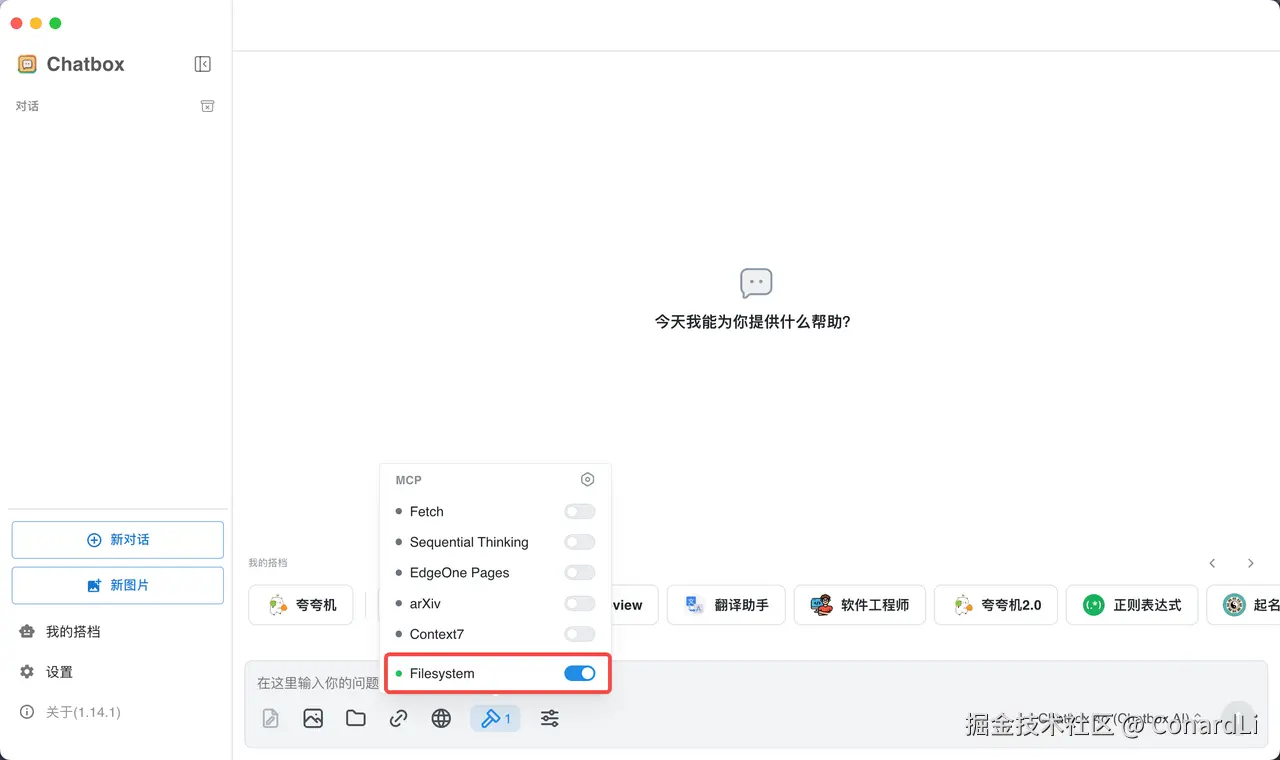 点击保存,然后打开聊天窗口,启用 Filesystem,后续就可以直接调用这个工具啦: