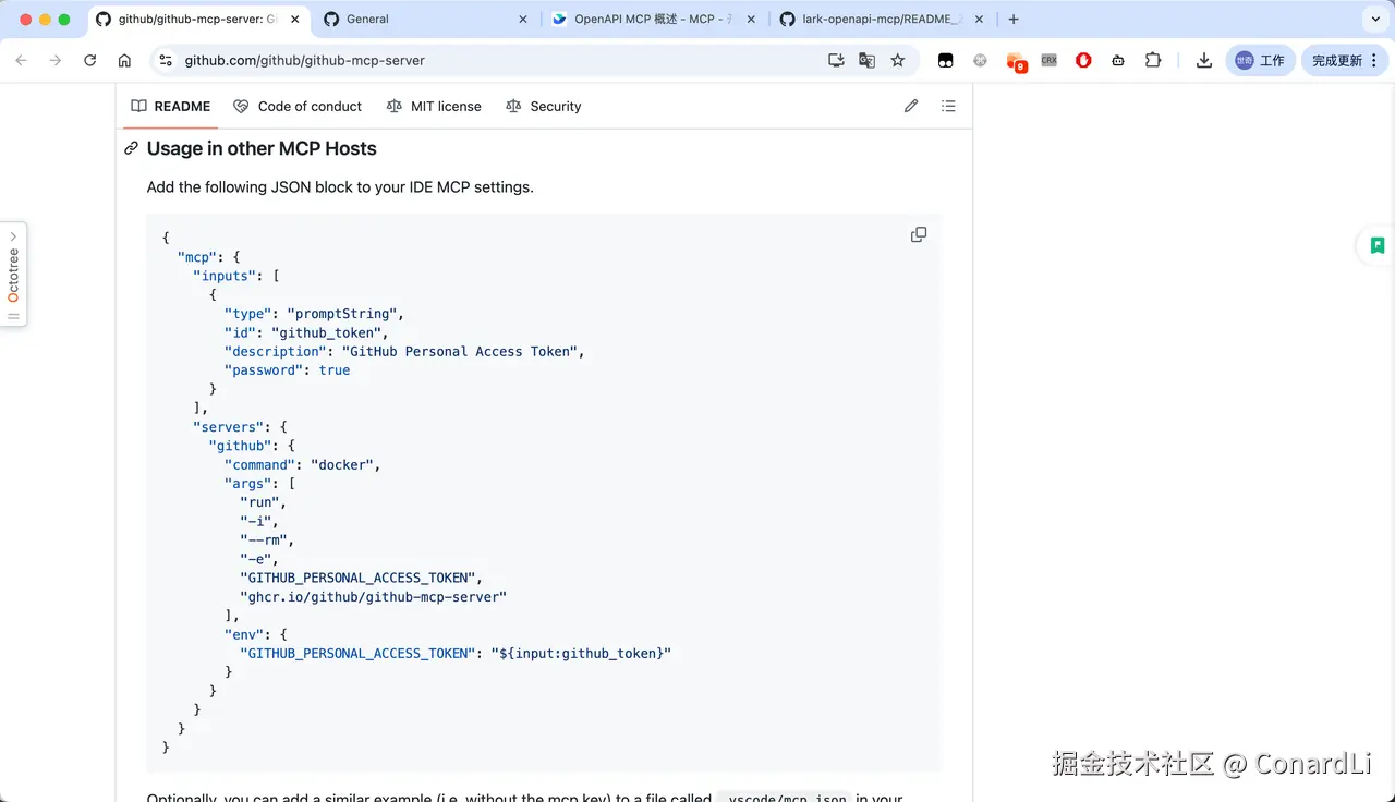 我们先配置一下 github-mcp-servcer , 在官方文档可以看到 Github MCP Server 是以 Docker 来运行的(需要你本地有 Docker 环境):