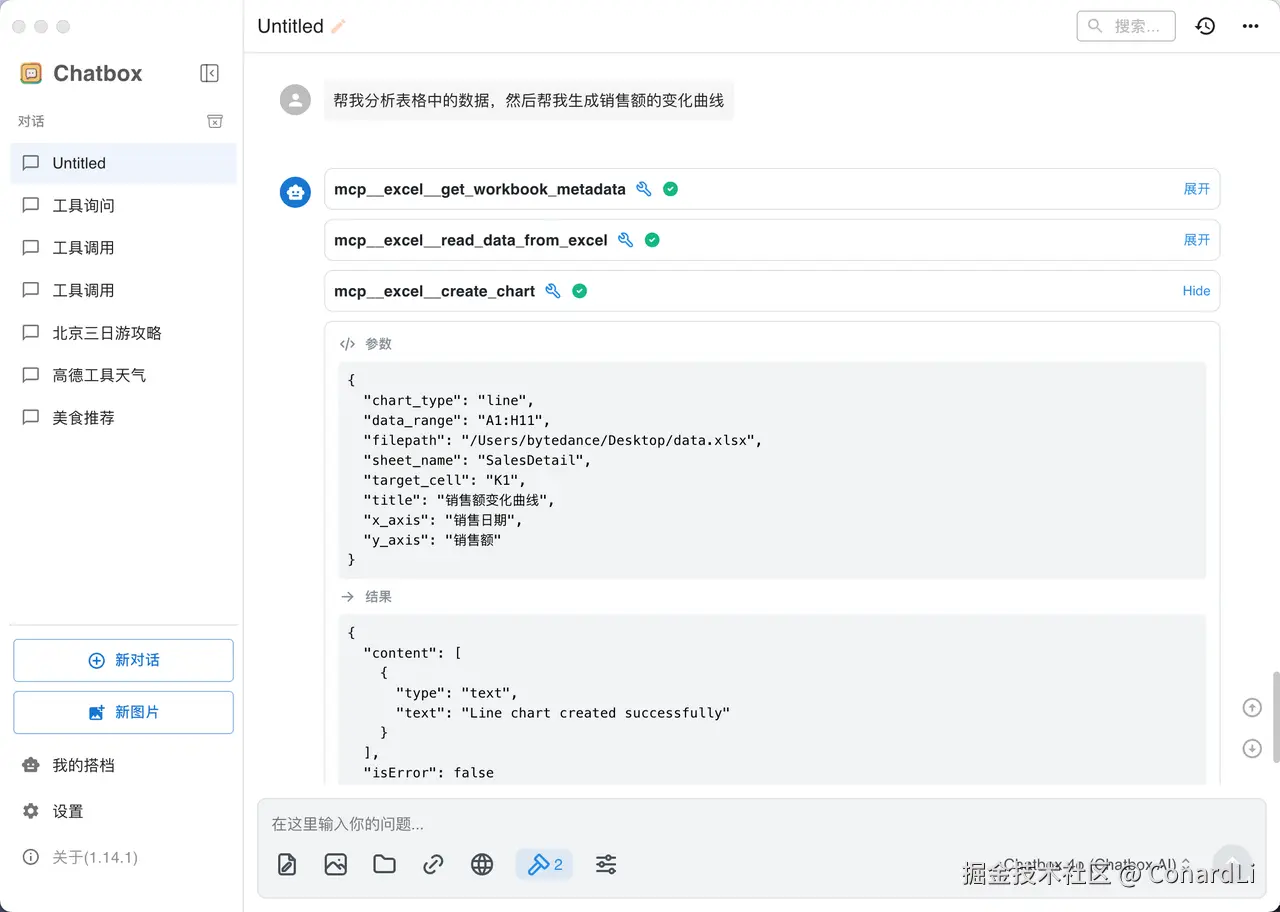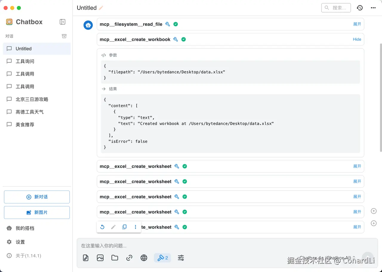 模型先调用了 Filesystem 工具,读取并分析了 data.md 文件,然后调用 create_workbook、create_worksheet、write_data_to_excel,将文件写入 excel: