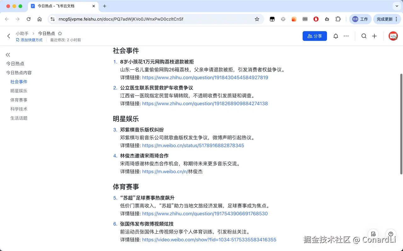 提示词:帮我分析今天的知乎热榜和微博热榜,然后将从两个网站得到的信息进行分类、汇总、去重,最终生成一份内容丰富的今日热点内容(去除政治、营销相关内容,不少于 10 条),要求每个内容必须有,分类、短标题、简单描述、详情链接。