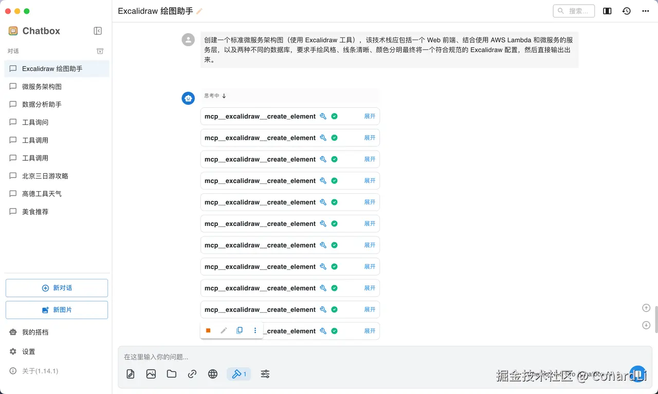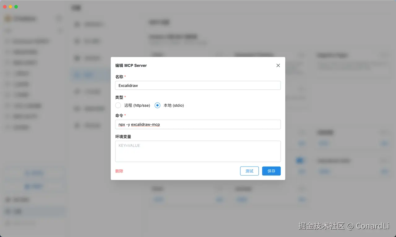 下面我们使用 excalidraw-mcp(github.com/i-tozer/exc… - MCP - 自定义 MCP 服务器】选择添加自定义服务器,选择本地,粘贴如下配置:npx -y excalidraw-mcp :