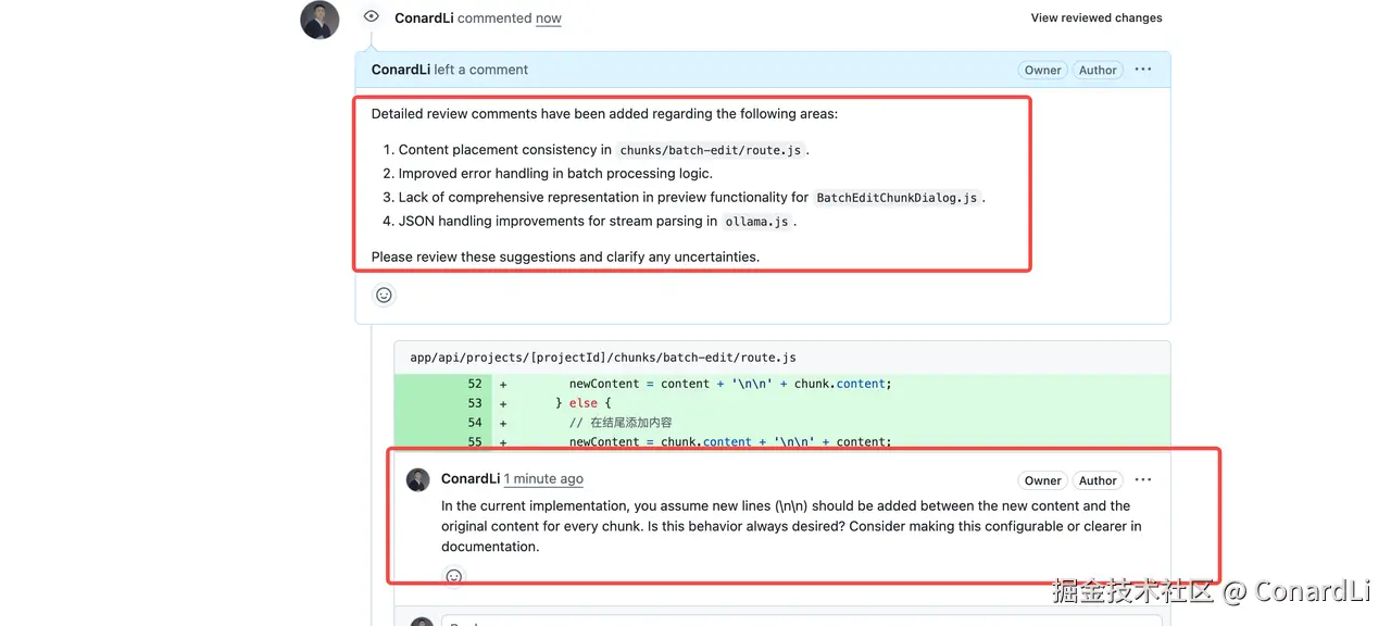 AI 自动生成了整个 PR 的评审结论,以及在具体的代码位置生成了评论: