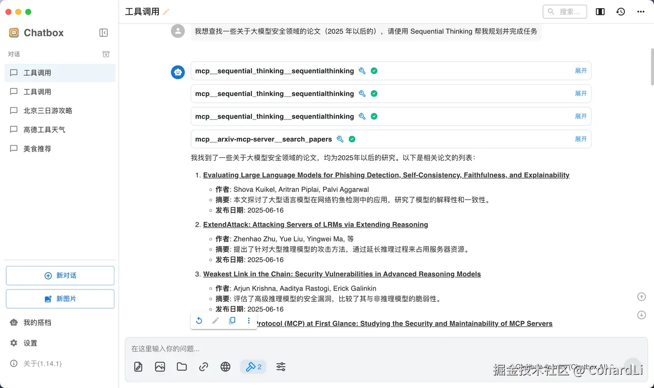 提示词:我想查找一些关于大模型领域的论文(2025 年以后的),请使用 Sequential Thinking 帮我规划并完成任务。