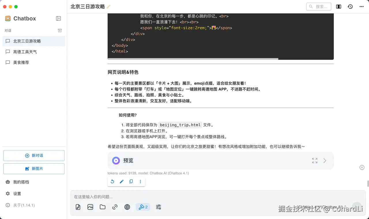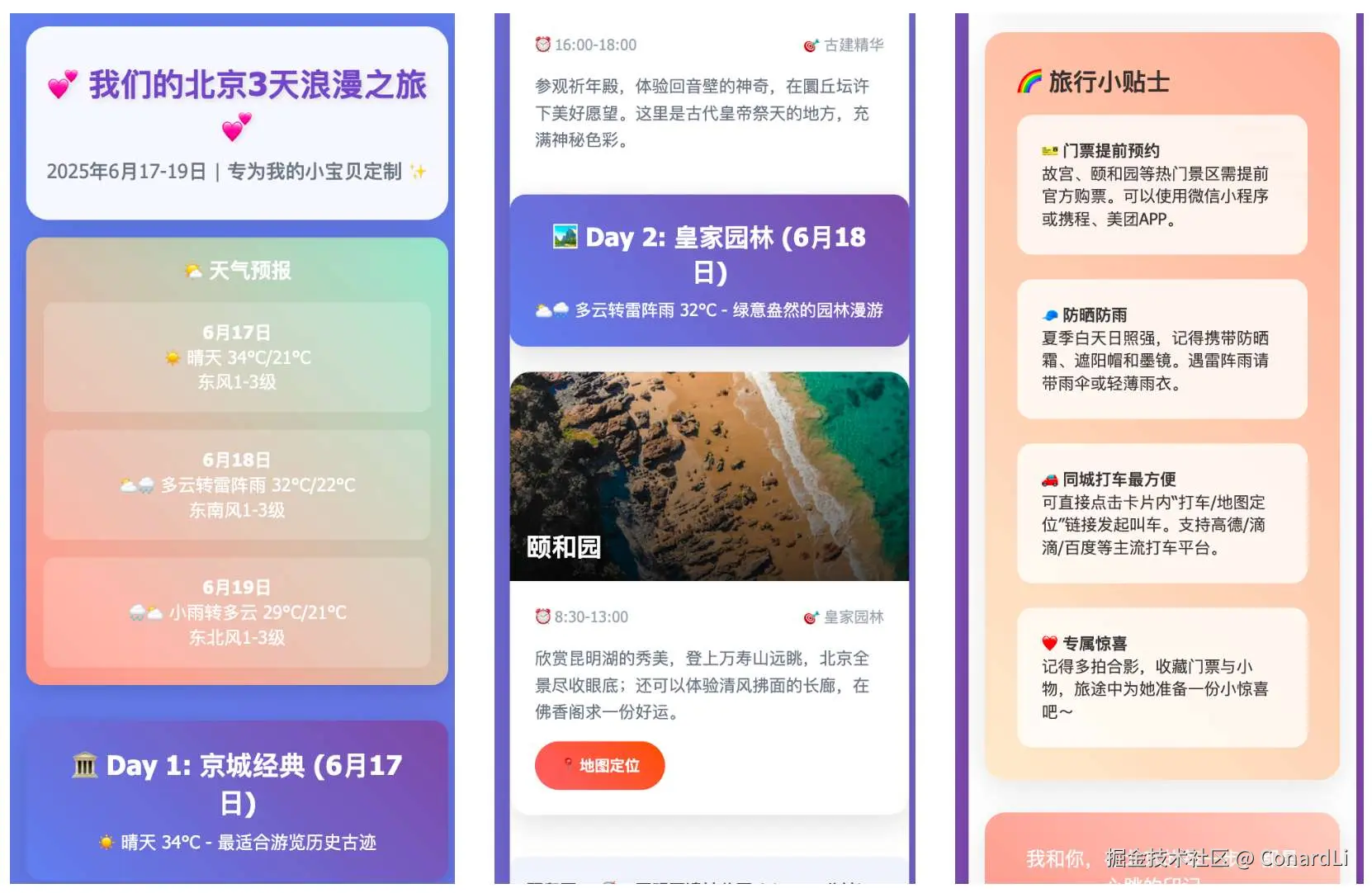 最终生成了一份非常美观的网页,包括天气、景点信息、时间安排、打车规划、旅行贴士等信息: