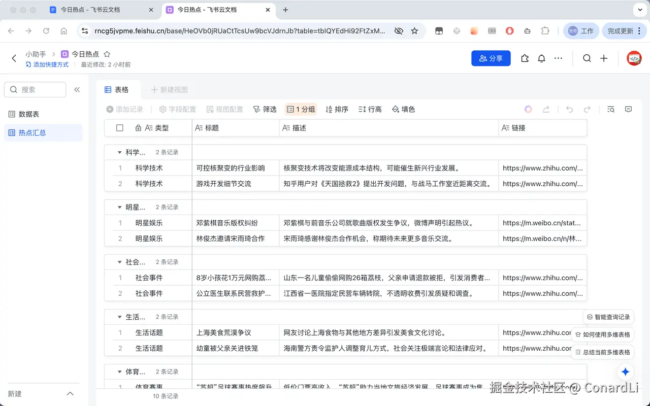 场景:做自媒体的同学,可能需要各种 “蹭热点” ,让 AI 帮你每天自动收集和整理最新热点信息。