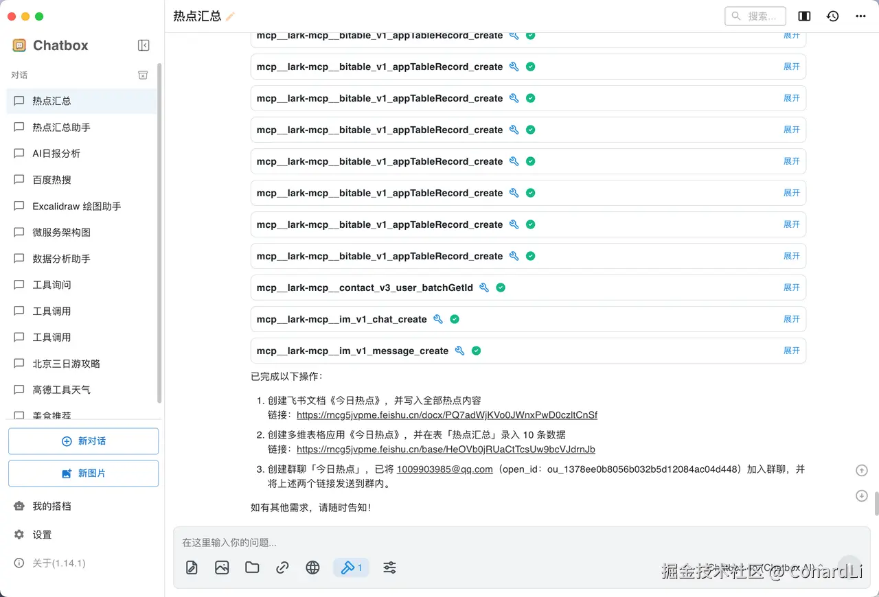 提示词:帮我分别创建一个飞书文档和多维表格,飞书文档按照标准格式写入完整的热点内容,多维表格按照类型、标题、描述、链接的格式进行录入,创建完成后。创建一个群聊,群聊名称为今日热点,然后将邮箱为 1009903985@qq.com 的用户拉进群,把这两个链接发到群里。