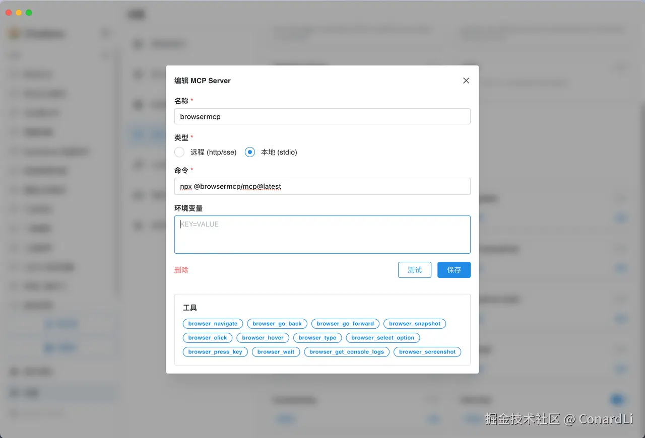 首先我们配置 @browsermcp/mcp( github.com/BrowserMCP/… ) ,进入【设置 - MCP - 自定义 MCP 服务器】选择添加自定义服务器,选择本地,粘贴如下配置:npx -y @browsermcp/mcp :