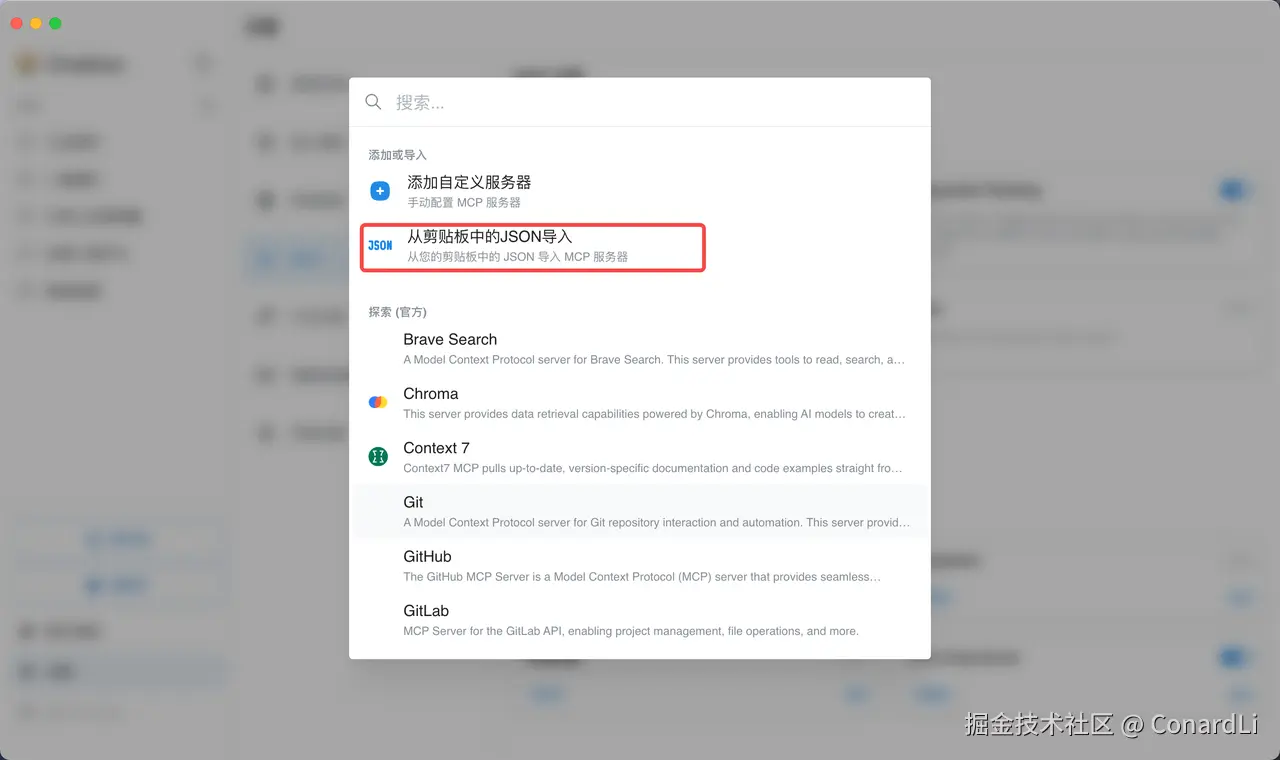 然后进入【设置 - MCP - 自定义 MCP 服务器】选择从剪贴板中的JSON导入: